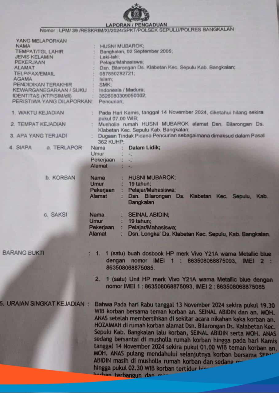 Diketahui, Laporan Nomor: LPM/39/RESKRIM/XI/2024/SPKT/POLSEK SEPULU/POLRES BANGKALAN, yang dialamami oleh salah satu warga Klabetan, Husni Mubarok (19), melaporkan kehilangan handphone merk Y21A Metallic Blue, yang dilimpahkan ke Polres Bangkalan.