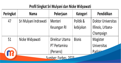 Kedua wanita (women) tersebut, yang masuk dalam kategori 100 (seratus) wanita paling berpengaruh di dunia versi Forbes tahun 2023, adalah Sri Mulyani Indrawati dan Nicke Widyawati.
