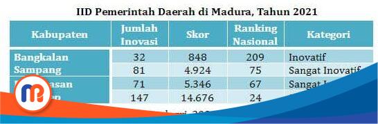 Data di laman Badan Litbang Kemendagri per-bulan April 2021 memperlihatkan bahwa Indeks Inovasi Daerah (IID) Pemerintah Daerah di Pulau Madura masuk kategori sangat inovatif dan inovatif.