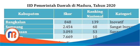 Dibandingkan dengan tahun 2019 kategori IID empat kabupaten tersebut tidak ada perubahan. Namun, dari segi skor dan rankingnya IIDnya mengalami pergeseran. Nilai skor IIDnya Kabupaten Sumenep 7.669, Kabupaten Pamekasan 3.093, Kabupaten Sampang 2.454, dan Kabupaten Bangkalan 848.