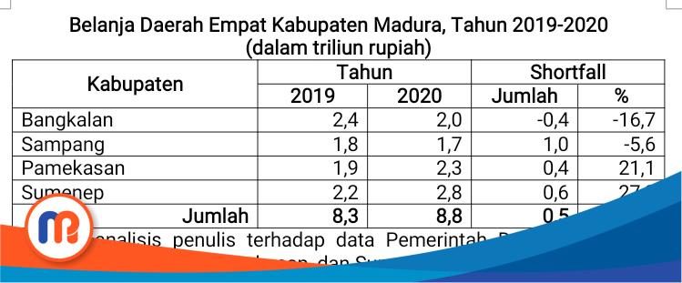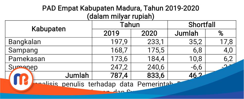 Berdasarkan analisis terhadap data Pemerintah Daerah Kabupaten Bangkalan, Sampang, Pamekasan, dan Sumenep TA 2019-2020, pada APBD TA 2019 empat kabupaten Madura pendapatan daerahnya secara akumulatif mencapai Rp7,9 triliun dan pada APBD TA 2020 menurun menjadi Rp7,8 triliun. Kontraksi anggarannya di TA tersebut sebesar -Rp0,1 triliun (-1,3%). Kabupaten yang mengalami kontraksi paling tajam adalah Kabupaten Sumenep, yakni mencapai -Rp0,3 triliun (-12,0%).