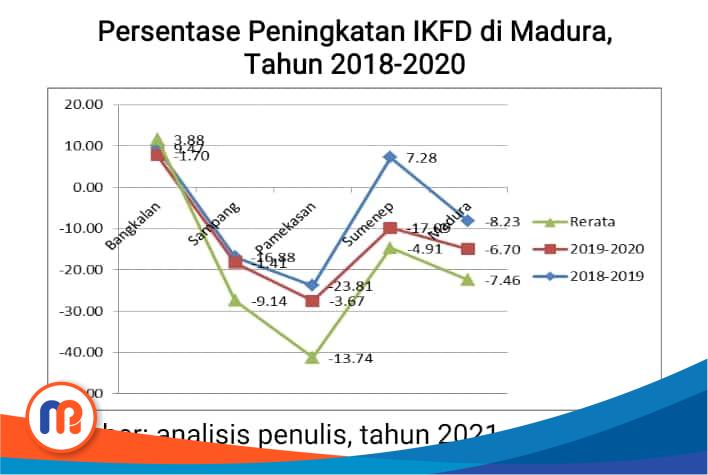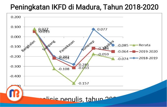 Peningkatan IKFD-nya tahun 2018-2020 mayoritas negatif, kecuali Kabupaten Bangkalan dan Kabupaten Sumenep tahun 2018-2019. Persentase peningkatannya mayoritas berada di angka minus, kecuali Kabupaten Bangkalan dan Sumenep tahun 2018-2019. Rata-rata persentase peningkatannya mayoritas tidak meningkat positif, kecuali Kabupaten Bangkalan.