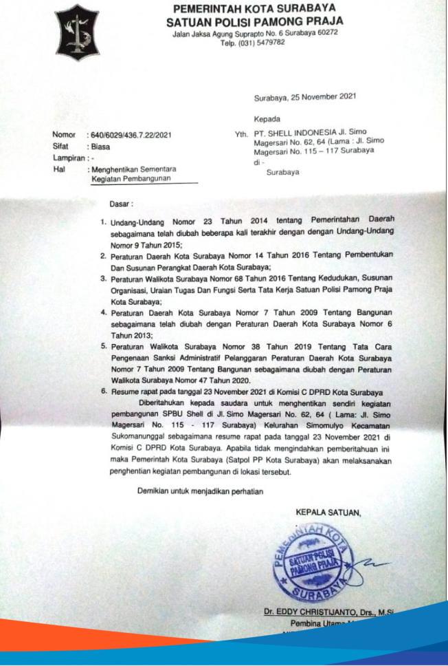 Kasatpol PP Kota Surabaya Eddy Christijanto telah menindaklanjuti resume tersebut dengan menyurati pihak SPBU Shell Simo Magersari tanggal 25 November 2021 agar menghentikan sementara kegiatan pembangunan. Selain itu, Kasatpol PP Surabaya dalam suratnya itu juga mengingatkan apabila tidak mengindahkan pemberitahuan ini, maka Pemerintah Kota Surabaya (Satpol PP Kota Surabaya) akan melaksanakan penghentian kegiatan pembangunan di lokasi tersebut.