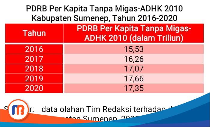 Berdasarkan ADHK 2010, PDRB Per Kapita Kabupaten Sumenep tahun 2016 sebesar 20,72 triliun, tahun 2017 meningkat menjadi 21,23 triliun, tahun 2018 meningkat menjadi 21,92 triliun, tahun 2019 meningkat menjadi 21,87 triliun, dan tahun 2020 menurun menjadi 21,56 triliun.