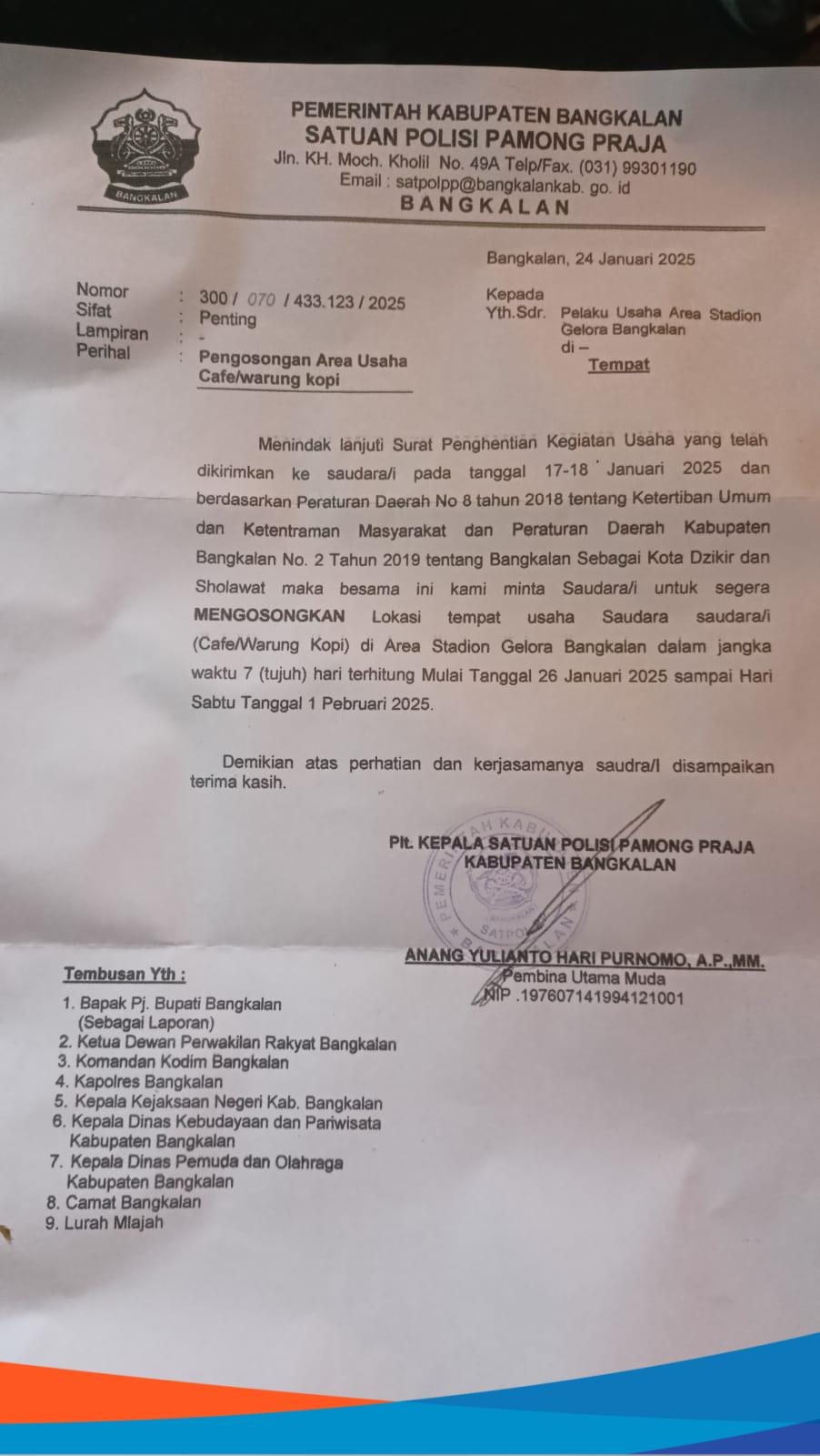 Bangkalan – Beredar Surat Edaran (SE) yang dikeluarkan Satuan Polisi Pamong Praja (Satpol-PP) Bangkalan, soal penertiban dan penggusuran Pedagang Kaki Lima (PKL) di area Stadion Gelora Bangkalan (SGB) dan Taman Rekreasi Kota (TRK) memicu perbincangan publik, Minggu (02/02/2025).