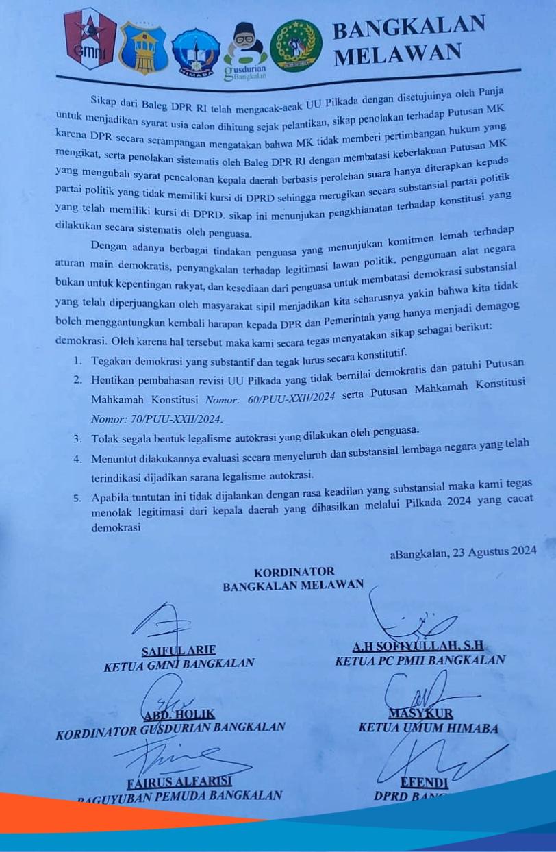 Oleh sebab itu, ratusan mahasiswa dari berbagai Ormik, yakni, PMII, HMI, GMNI, Paguyuban Pemuda Bangkalan (PPB), dan Pecinta Gusdur (Gusdurian) Bangkalan desak wakil rakyat Bangkalan untuk menghentikan revisi UU Pilkada.
