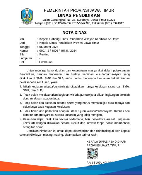 Bangkalan – SMP dan SMA Al-Anwari di Tanah Merah, Bangkalan, tetap menggelar acara wisuda meski ada himbauan dari Dinas Pendidikan Jawa Timur (Jatim) agar SMA, SMK, dan SLB tak melakukan wisuda. Himbauan tersebut telah tertuang dalam Nota Dinas Dinas Pendidikan Jatim Nomor 000.1.5/1506/101.5/2024, Sabtu (31/05/2025).