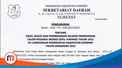 Badan Kepegawaian dan Sumber Daya Manusia (BKSDM) umumkan hasil akhir penerimaan Calon Pegawai Negeri Sipil (CPNS) formasi tahun 2021.